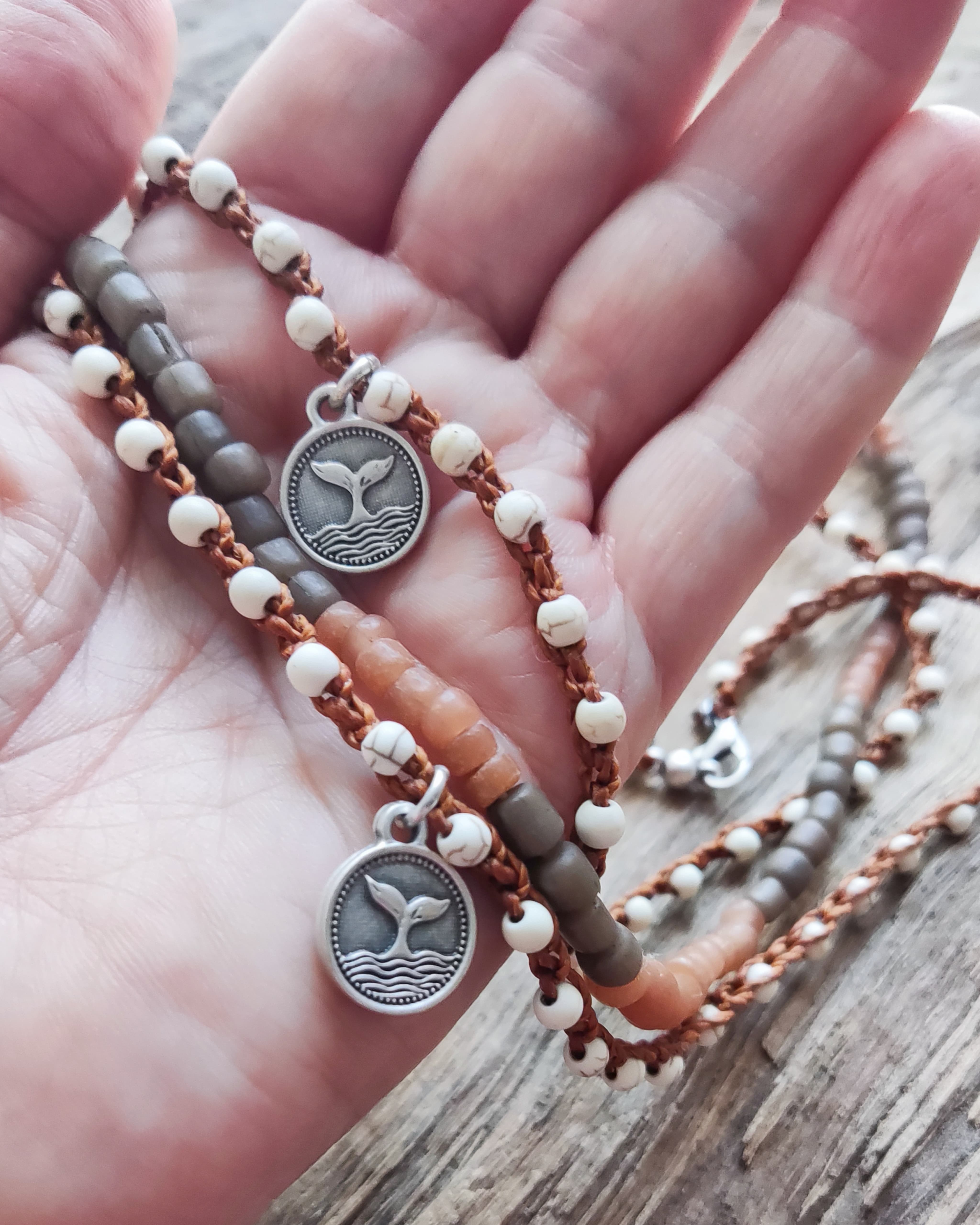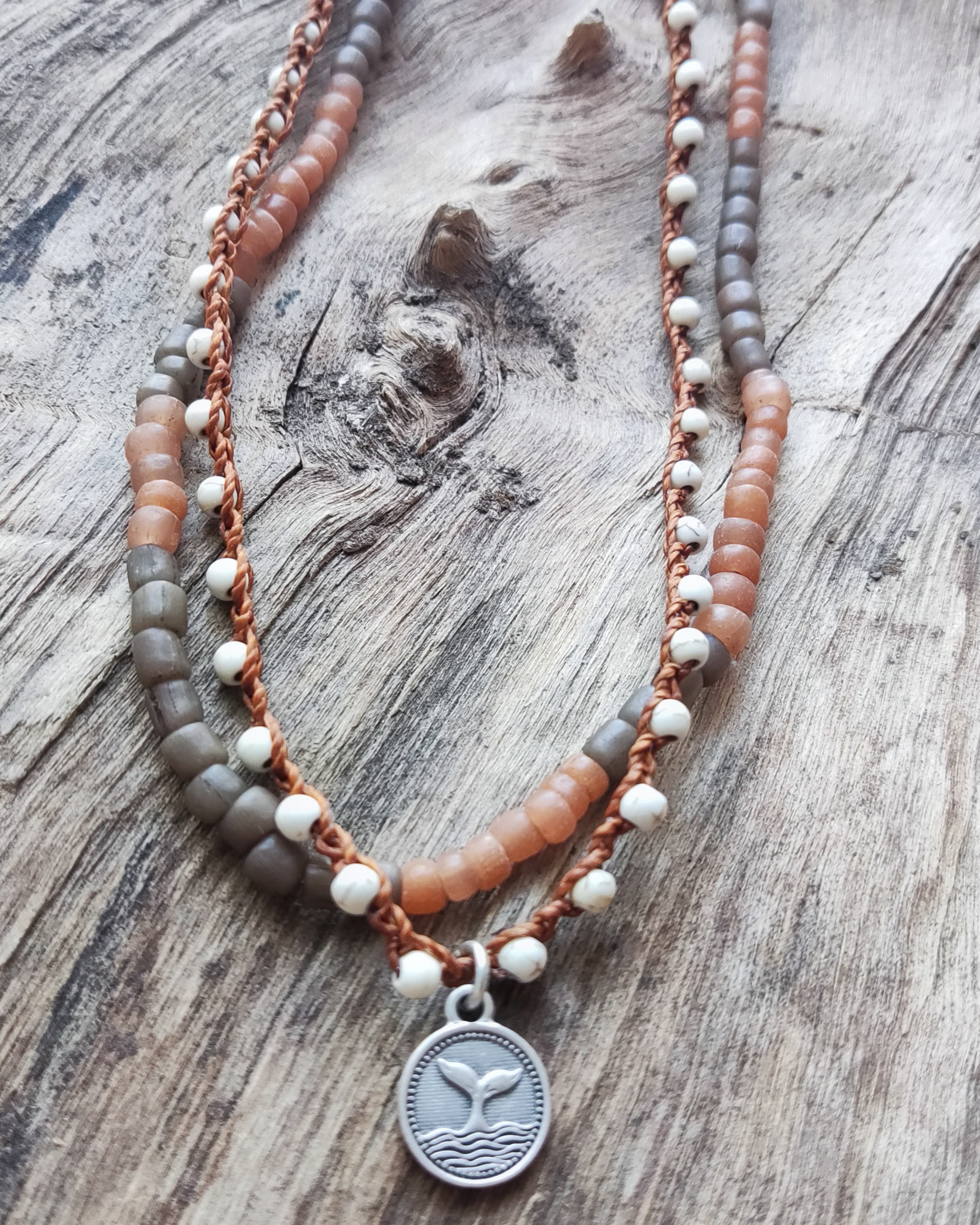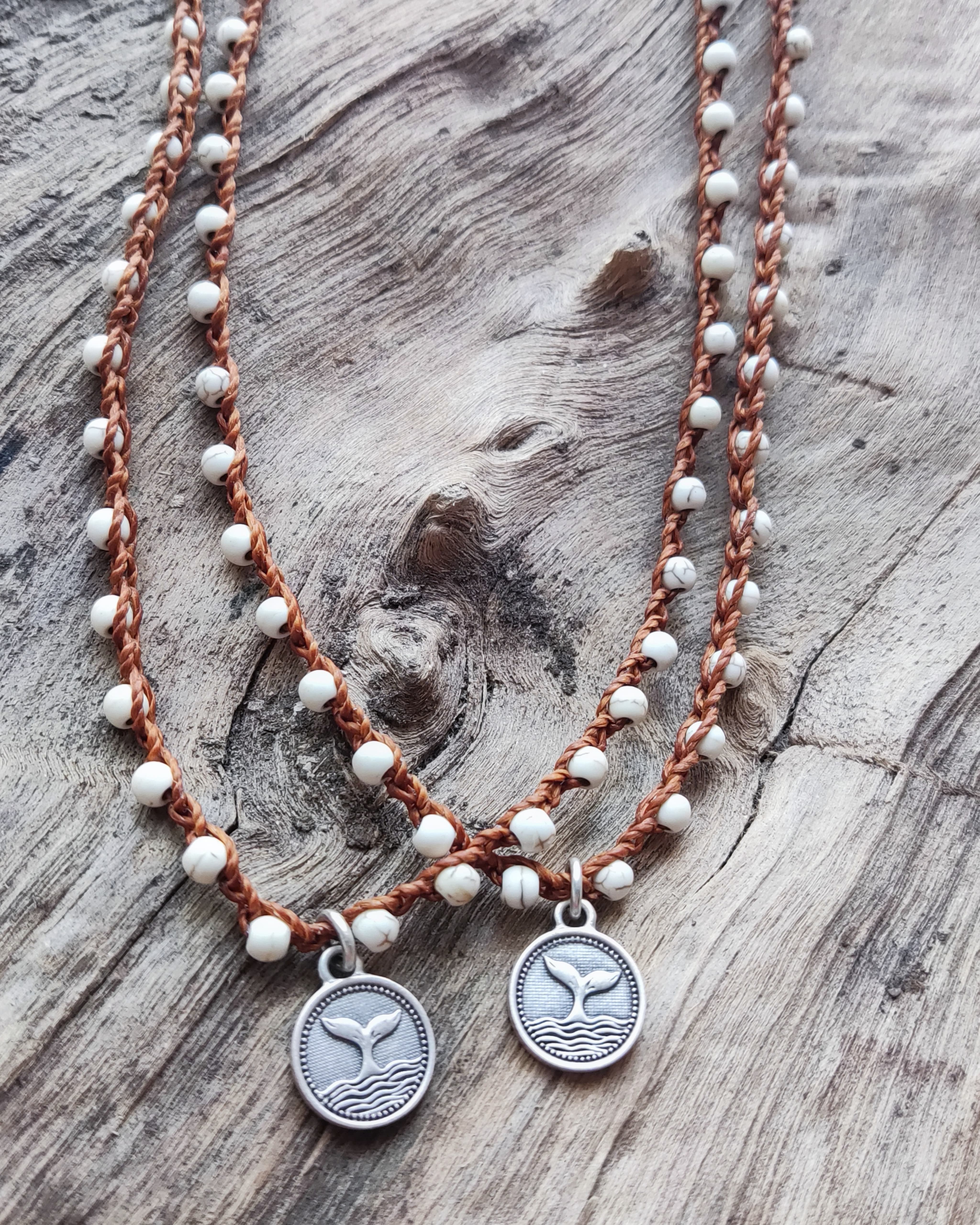 A arte do Crochet é muito versátil. Colar feito com fio encerado a crochet e contas pequenas de howlita branca. Medalha banhada a prata de dupla face.