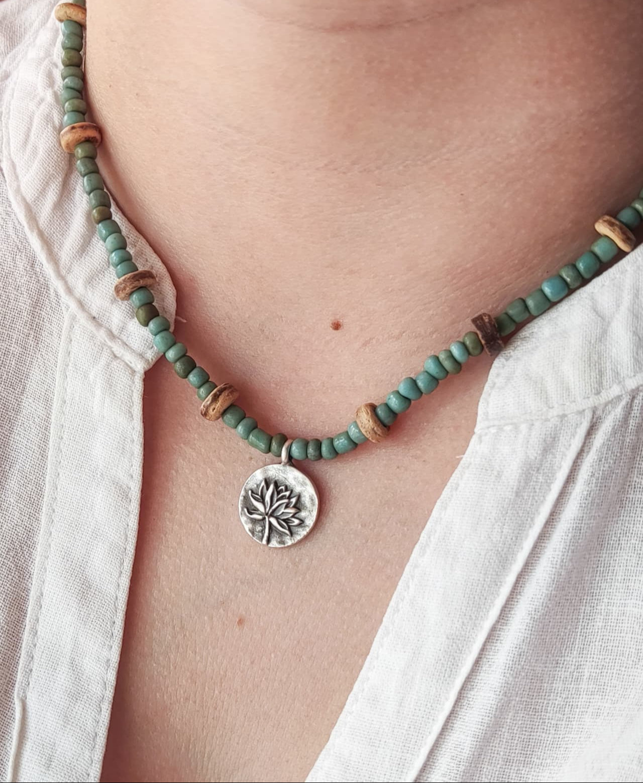 Colar curto de missangas de vidro verdes com apontamentos de pequenos discos de coco. Linda medalha de flor de Lotus banhada a prata antiga. Fecho de lagosta em aço inoxidável.