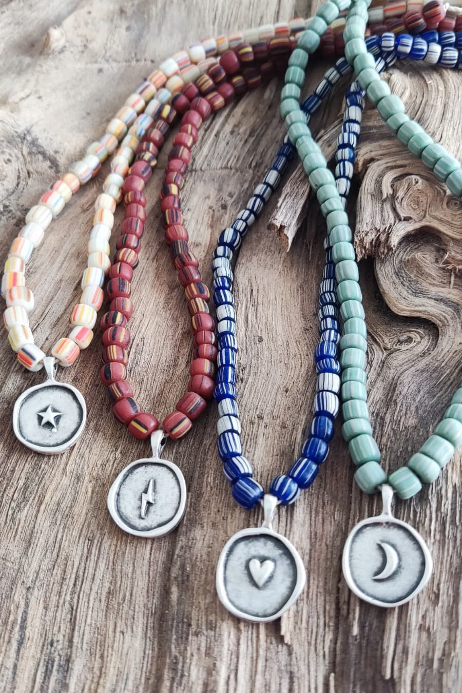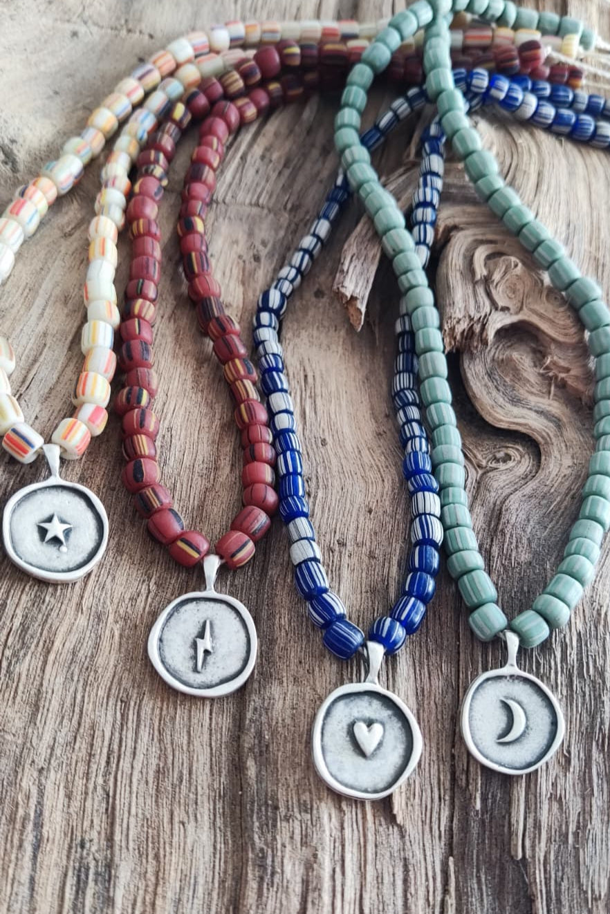 Colares de missangas de vidro listadas verdadeiras com lindas medalhas banhadas a prata antiga. Estes colares têm fecho de lagosta de aço inoxidável.